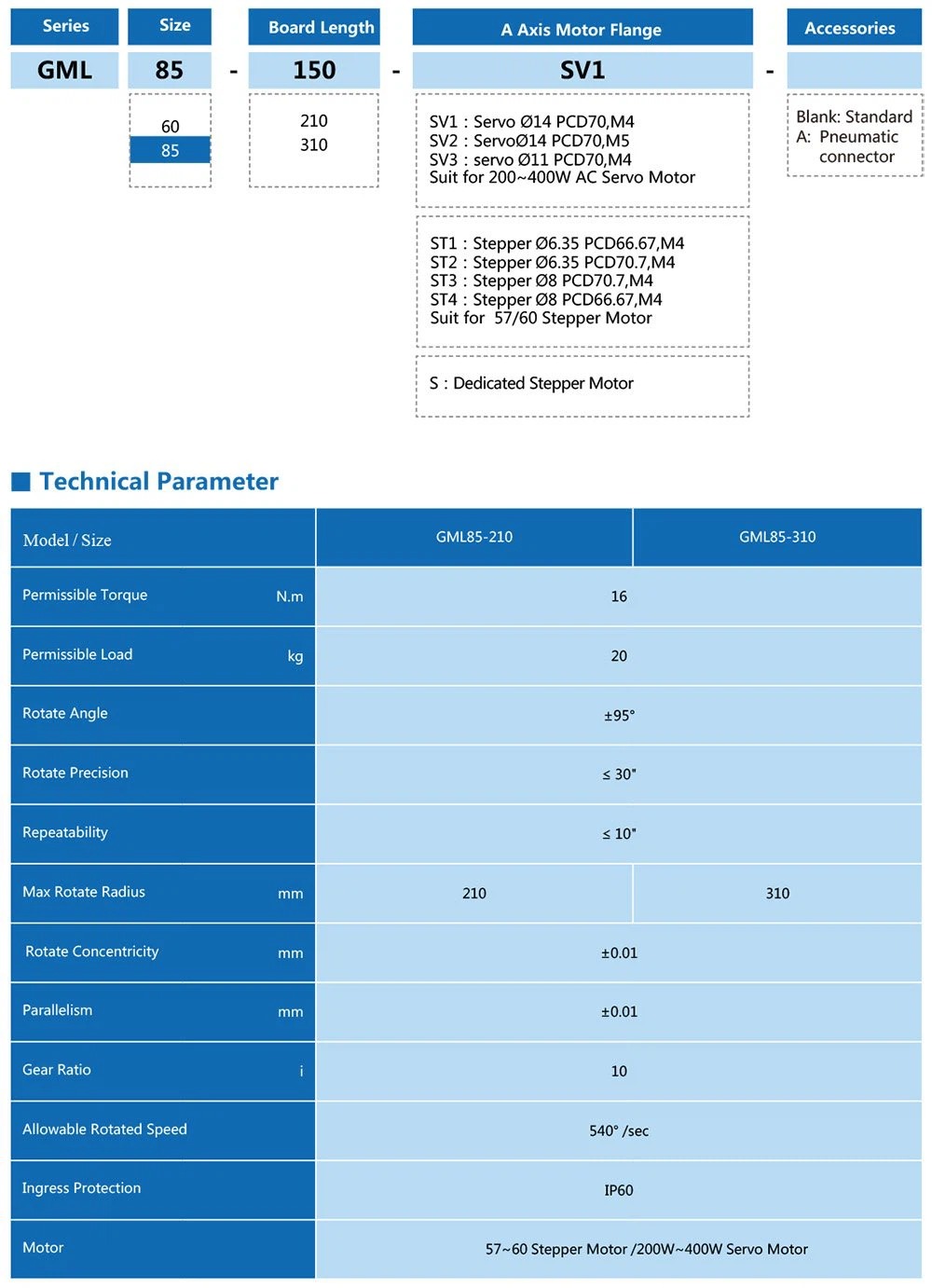 The G+ GML series precision mini rotary axis has a repeatability can arrive to ≤10 arc-sec. It adopts a miniaturized design with a small size and light weight, making it suitable for scenes with limited space.