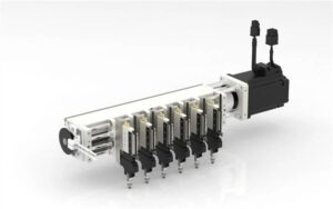 It is an intercom linkage with 8 piece of slider group. The drive method can be suitable for 28 stepper motor. Sensors and installation direction, left or right, can be customized according to equipment requirement.